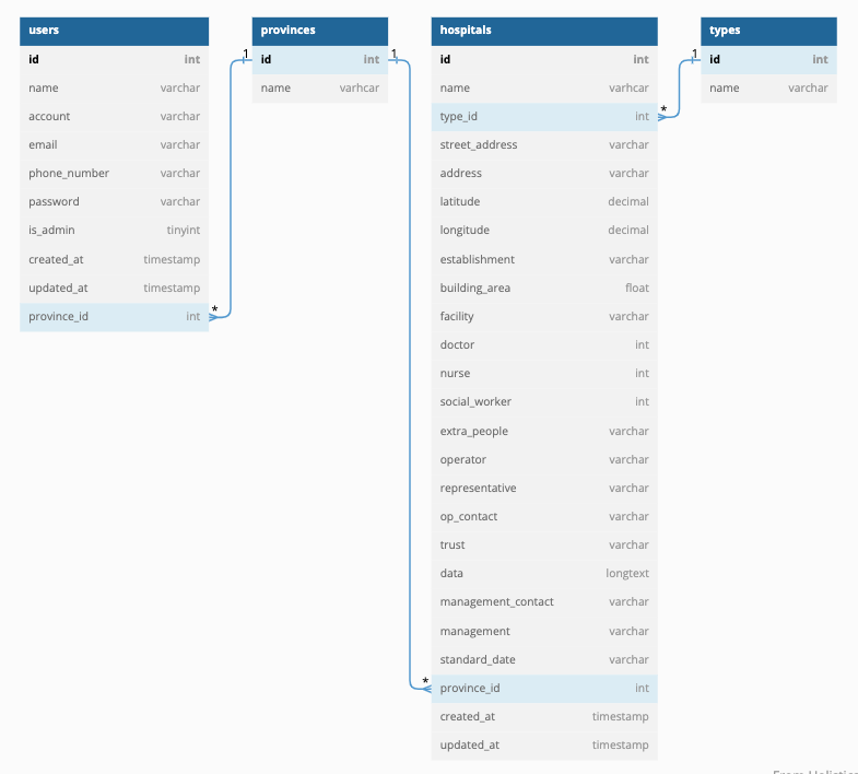 - hospitals에는 전국치매센터표준데이터 이 데이터들이 들어가는데 주소데이터를 파싱해서 시/도(특별시 광역시나 도)별로 분류할 수 있도록 province_id를 넣어서 지역 테이블과 연결시켰다.