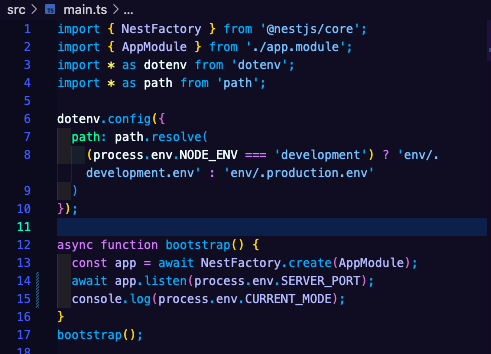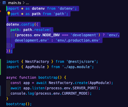 하고 main.ts의 코드를 바꿔봤다 이렇게 환경변수 설정을 위로...