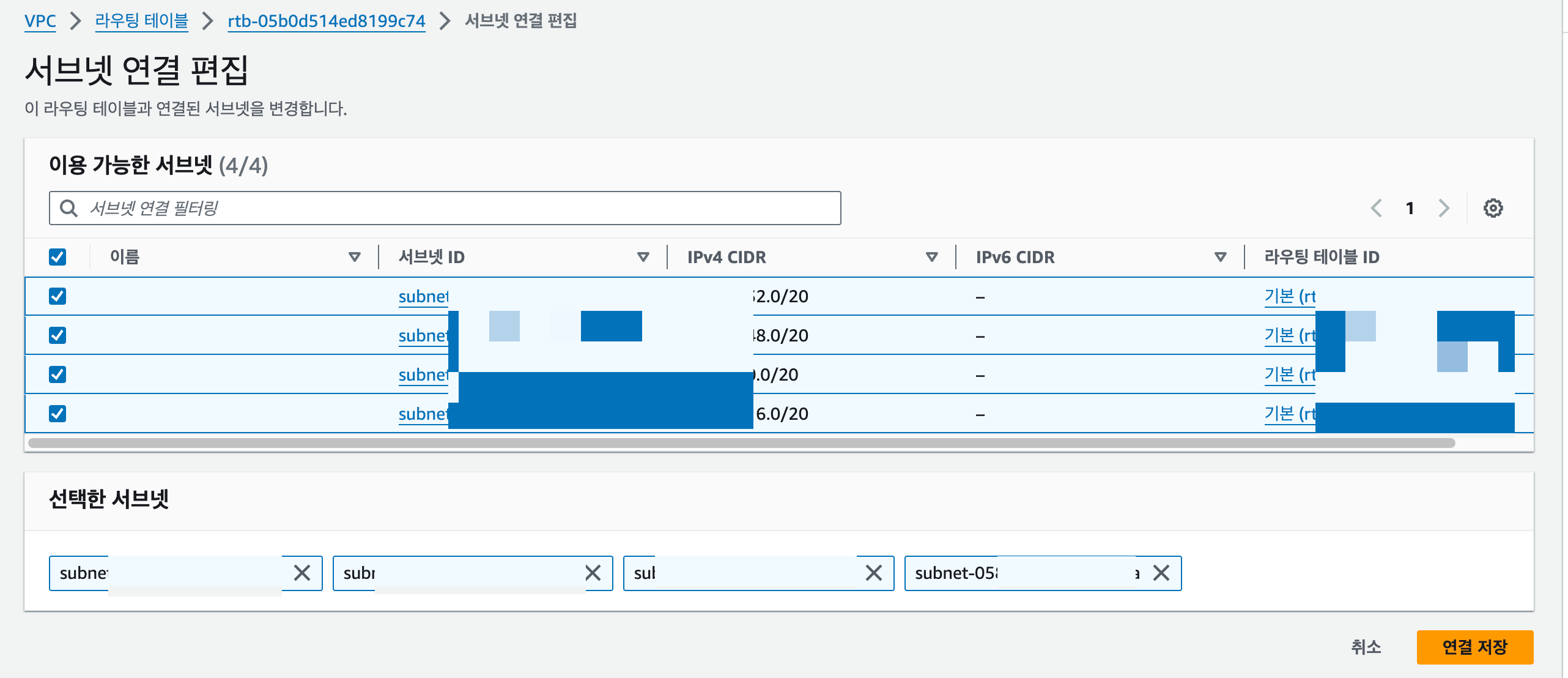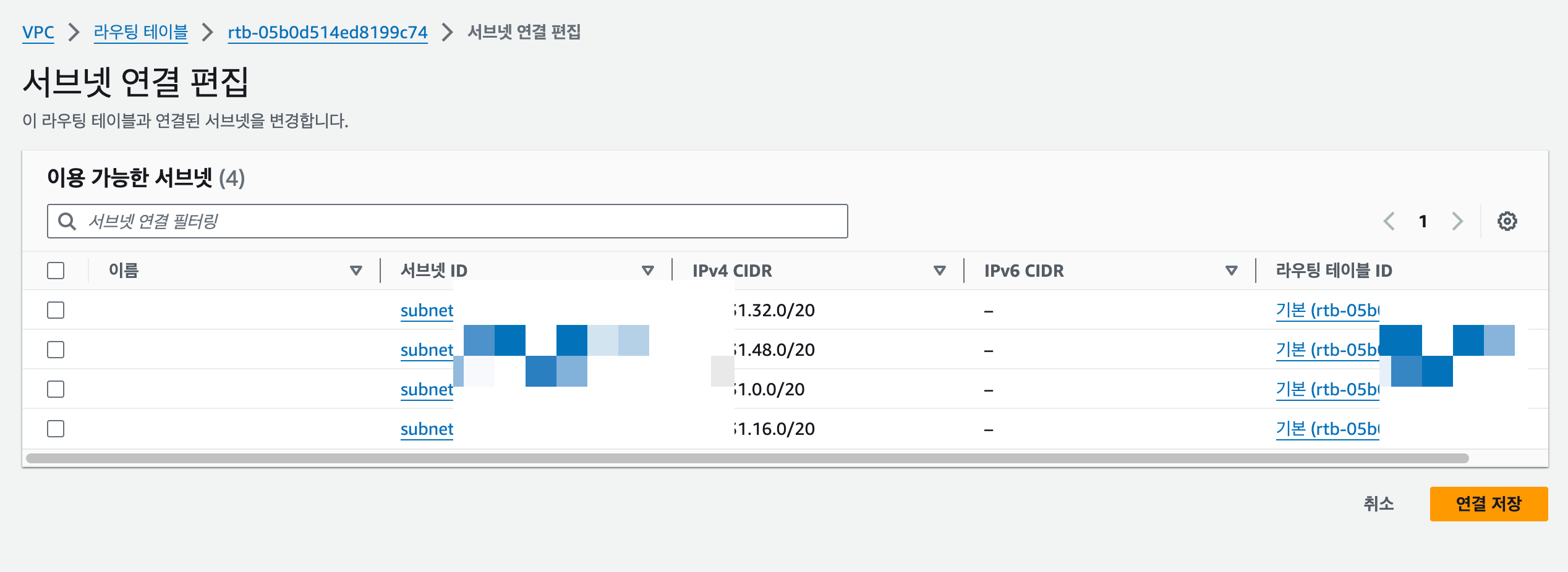 - 작업(Actions) > 서브넷 연결 편집(Edit subnet associations) 선택