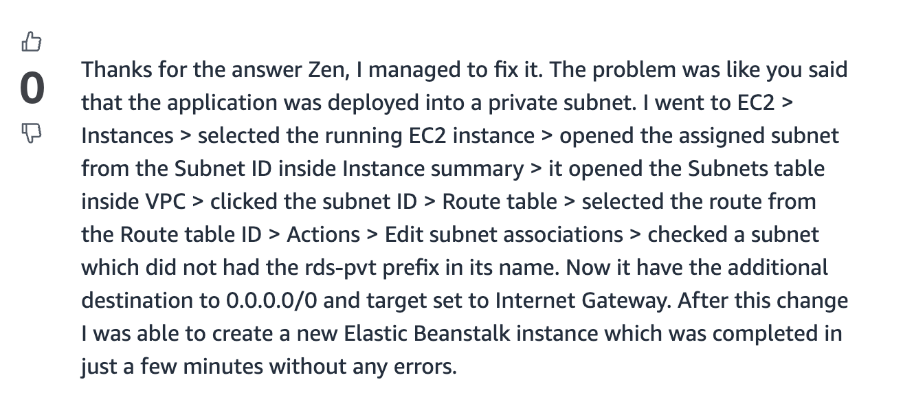 이제 0.0.0.0/0로 가는 추가 목적지가 있고, 타겟은 인터넷 게이트웨이로 설정되었습니다. 이 변경을 한 후에는 새로운 Elastic Beanstalk 인스턴스를 오류 없이 몇 분 만에 생성할 수 있었습니다.