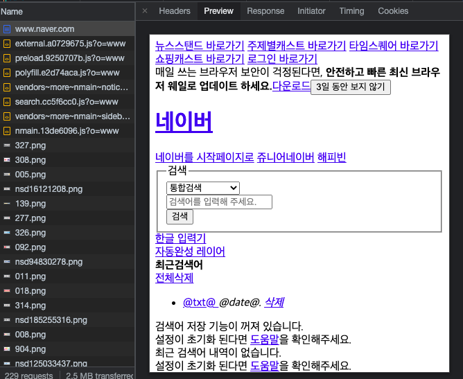 네트워크 패널을 열고 네이버 홈페이지를 새로고침 하면 이렇게 페이지를 로딩하는데 필요한 모든 리소스들이 호출되는 과정을 볼 수 있다